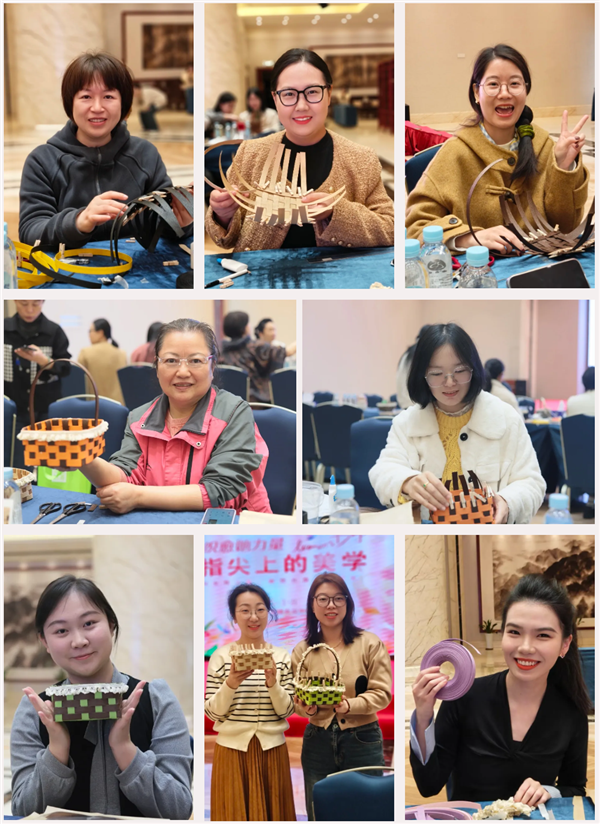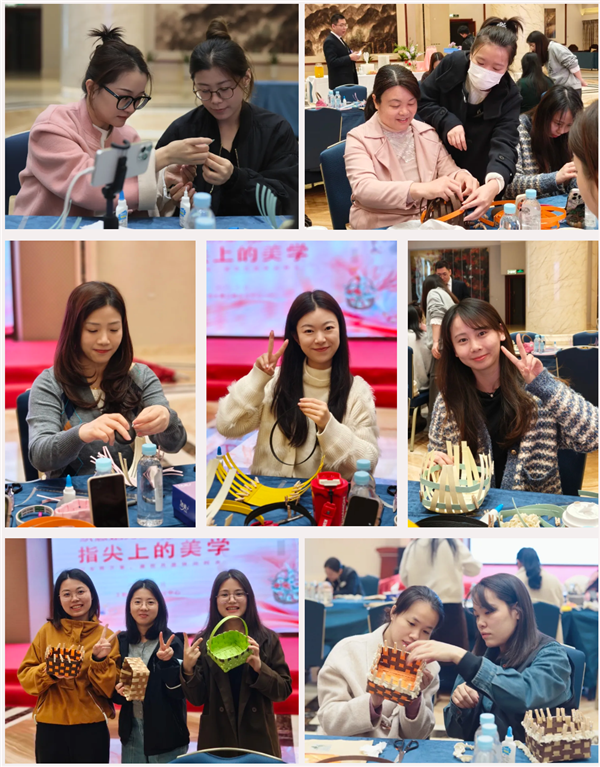 在手工编织环节,大家兴致勃勃,纷纷拿起手中的纸藤,用心编织属于自己的独特作品。现场欢声笑语不断,洋溢着温馨和谐的节日氛围。