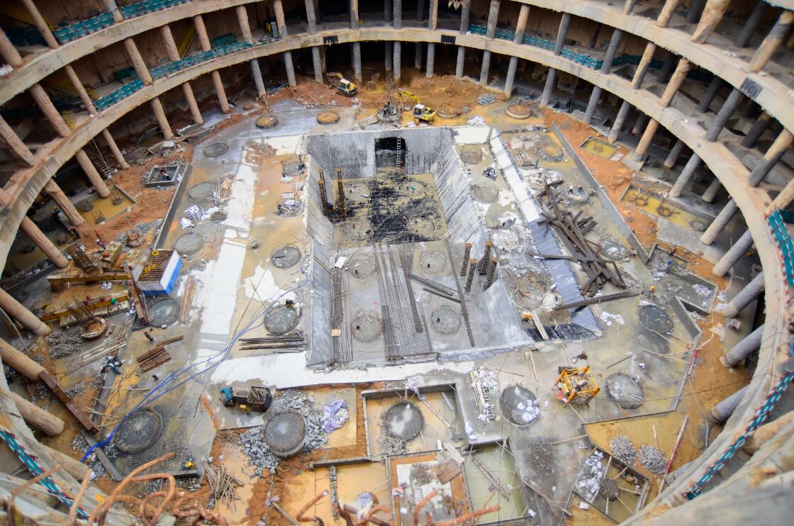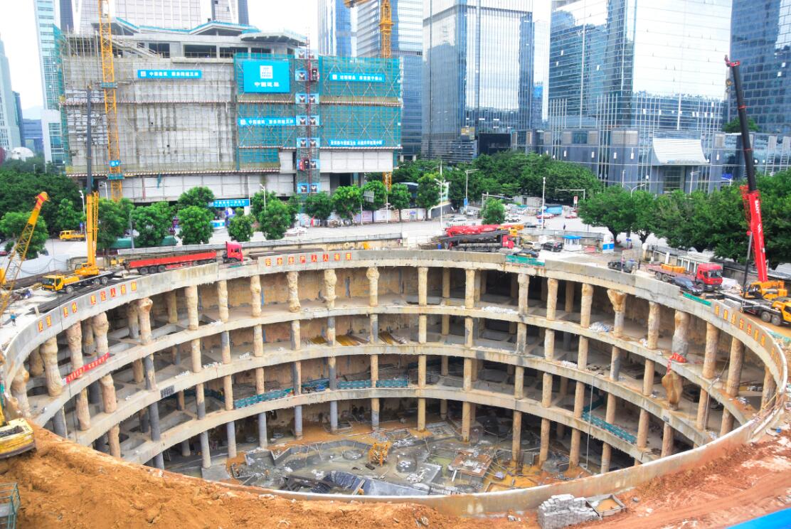 平安金融中心南塔为高289m、地上52层、地下5层的超高层建筑。基坑采用“地下连续墙+内支撑”的支护形式,地下室采用桩筏基础,桩基础均为人工挖孔扩底灌注桩形式。现场绿色、文明施工达到美国绿色建筑协会 leed 金奖认证。